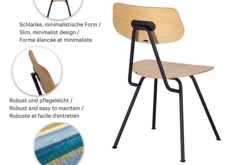 - Flexibel concept: eikenfineer (naturel/zwart) of gestoffeerde zitting in een ruime keuze aan materialen en kleuren.